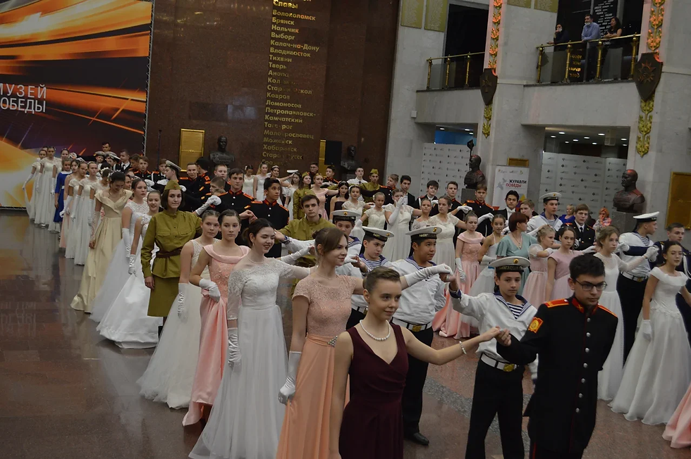 Арт-волонтеры отряда "ДоброСовы" и активисты совета обучающихся при ГБОУ "Школа 2053", ГБОУ "Школа 2051", ГБОУ "Школа 1595" и Технологического колледжа №24 в военной форме 1941-1945 годов исполнили в центе зала мазурку и полонез, вальс и кадриль, падеграс и игру в ручеёк.
